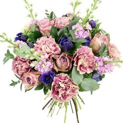 Discover the unique beauty of our breathtaking bouquet, featuring vibrant blue hydrangeas, soft light purple roses, fresh green lisianthus, pristine white spray roses, delicate Ammi visnaga, charming pink bouvardia, and elegant pink astilbe. This stunning combination creates a magical and sophisticated display, perfect for gifting to your loved ones.